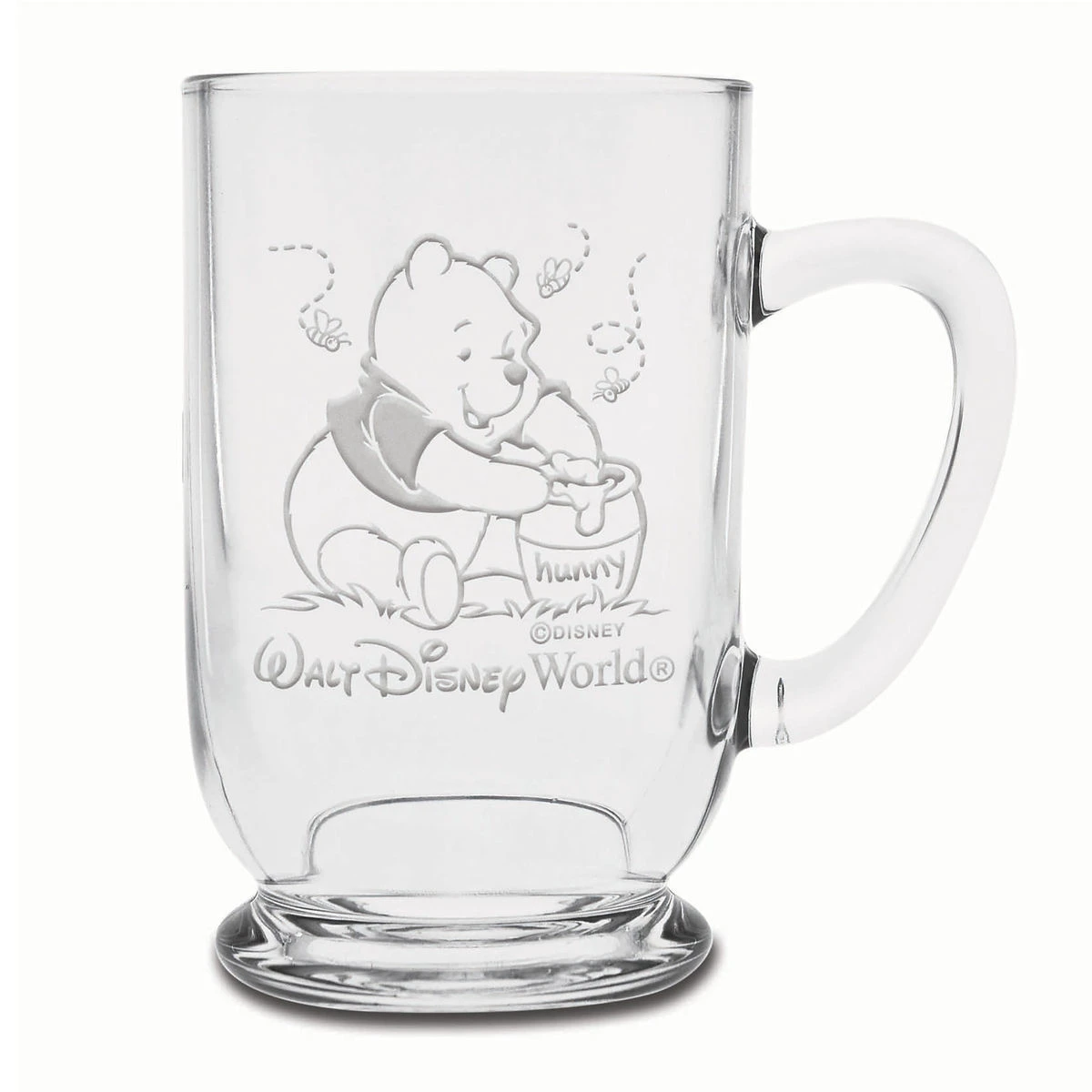 With its spacious 16 oz. size, this Winnie the Pooh glass mug can hold a lot of hunny. The lovable bear tucks into his favorite food on this Walt Disney World glass etched with a design that can be personalized to make a unique present.