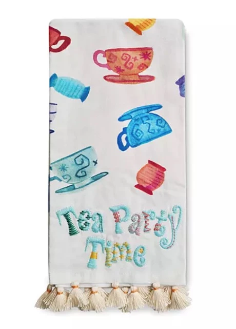 Celebrate very merry unbirthdays and mad tea parties in style with our colorfully fun kitchen towel covered in teacups and lanterns. Tassel trim and embroidered lettering are delicious details that will make your kitchen feel like a wonderland.