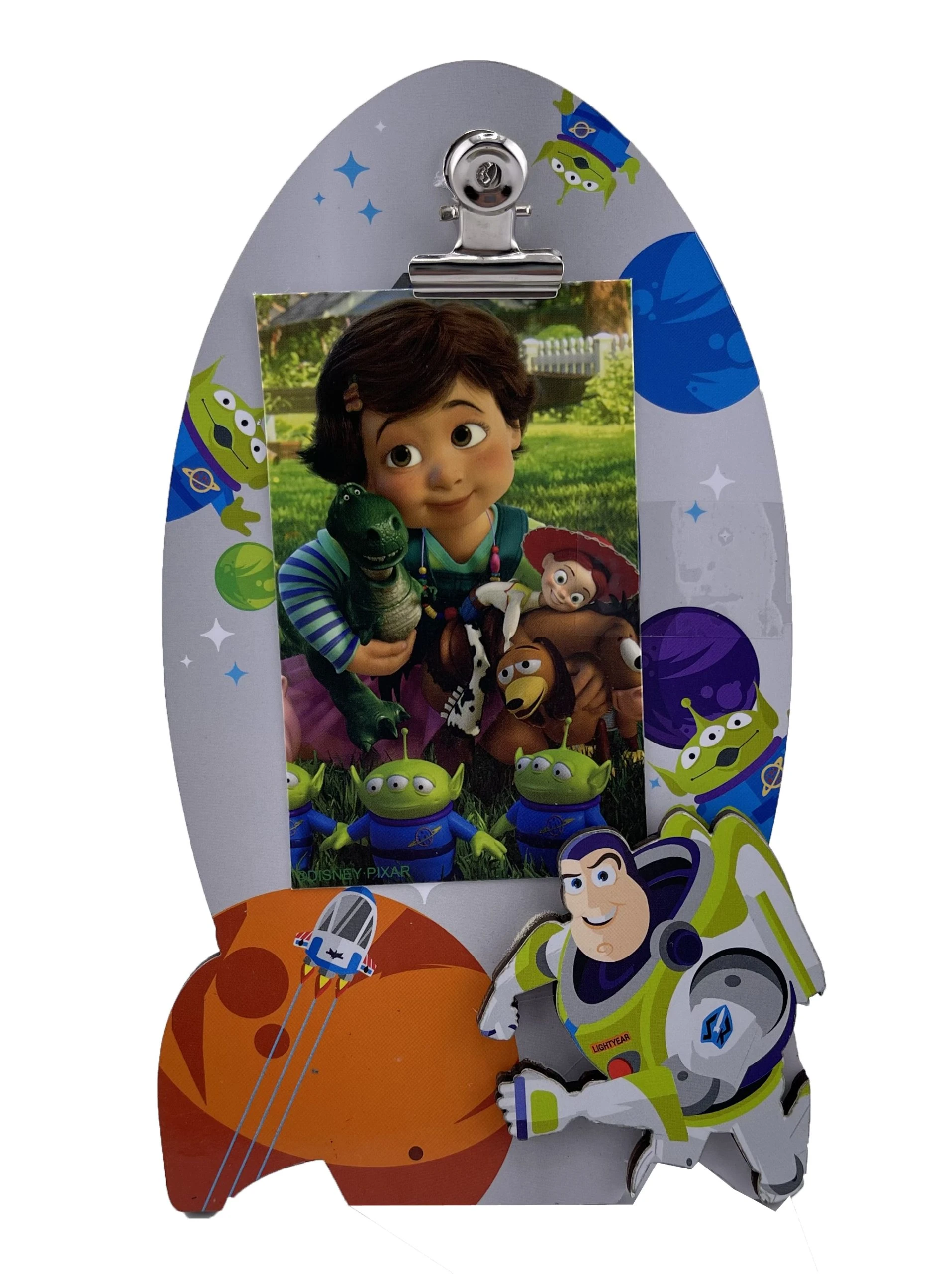 This Magnet Frame Features Buzz Lightyear and his Spaceship to clip a Photo. It also is Magnetic or it has a pull out Stand.