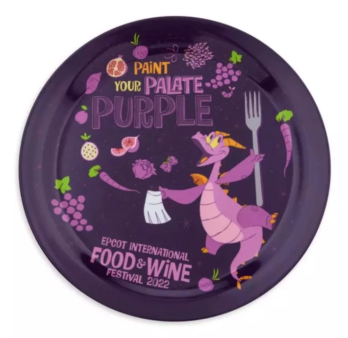This fun plate reminds you to ”paint your palate purple” with artwork of Figment the dragon and delicious purple food. Made of durable melamine, it makes a wonderful souvenir of the 2022 EPCOT International Food & Wine Festival.