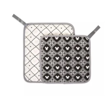 Hold everything! Get to grips with Mickey who features on these elegantly designed pot holders from our Disney Homestead Collection. Set includes one square holder with black pattern and pocket, and one rectangular holder with beige pattern.