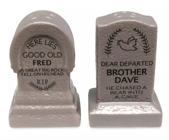- Salt reads: ”Here lies Good Old Fred – A great big rock fell on his head”