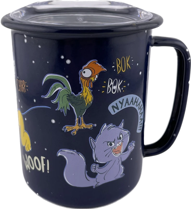 A whole host of Disney critters have flocked together . . . or been herded up on this enamel travel mug. Pluto, Hei Hei, Pascal and Meeko are among those included in the cute artwork which features some of the odd noises these assorted animals are inclined to make. The sturdy metal mug has an enamel finish and handle, and includes a lid to keep out thirsty wildlife.