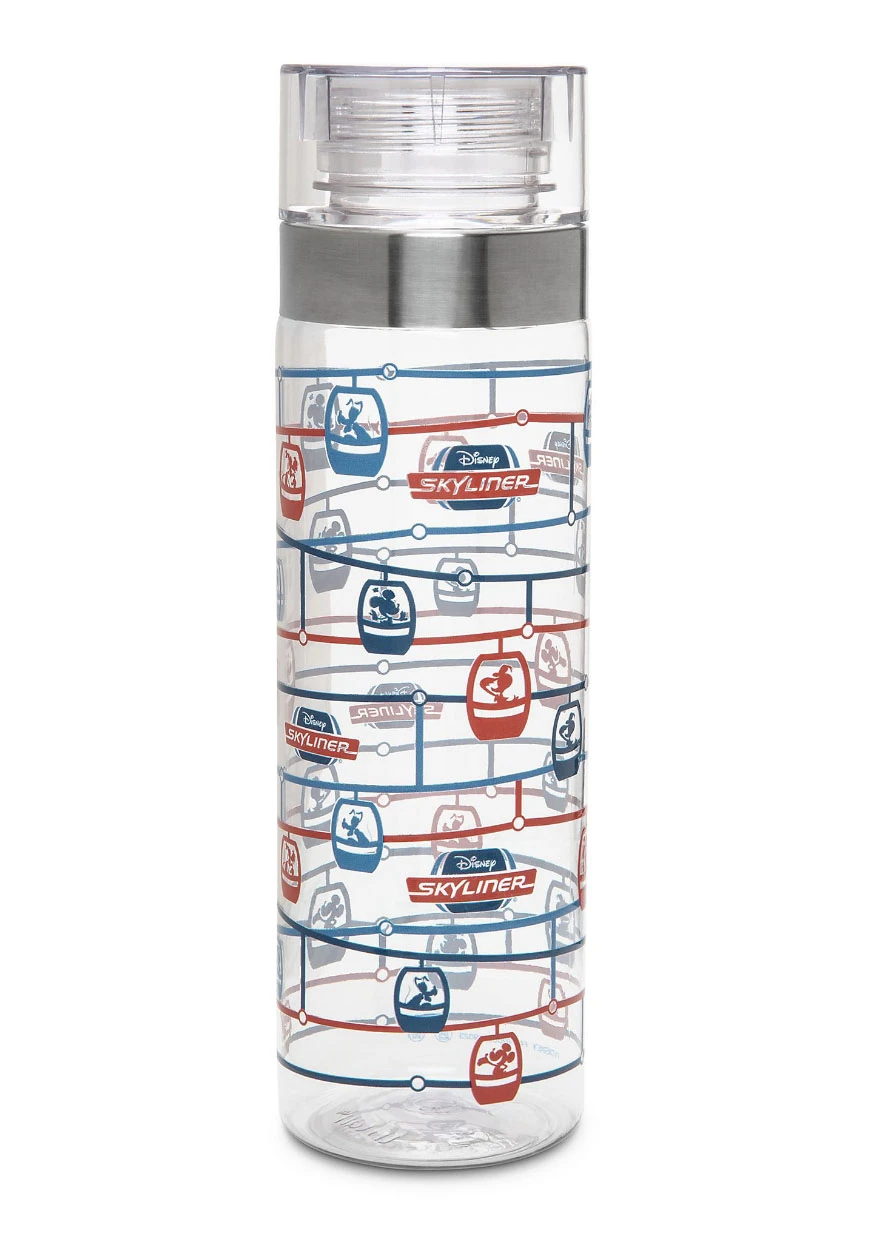 Fly high above thirst with this clear water bottle. Disney’s Skyliner transportation system inspires a contemporary graphic print featuring Mickey and the gang in soaring gondolas.